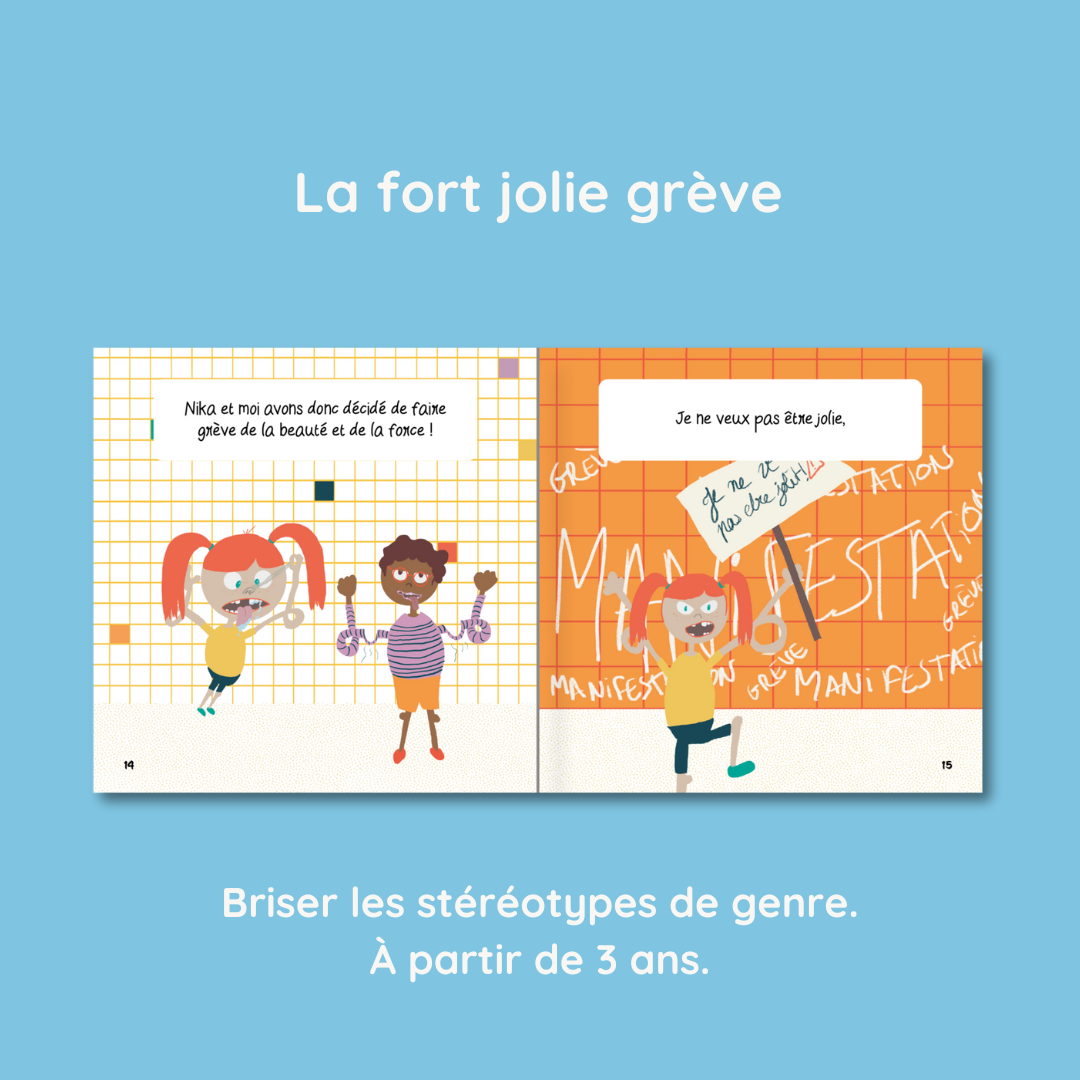 Des couleurs intenses pour une histoire atypique et rigolote. Lassés de recevoir sans arrêt les mêmes compliments stéréotypés, Léo et Nika vous racontent comment et pourquoi ils ont décidé de faire la grève de la beauté et de la force. En plus d’être drôle, ce livre permet de balayer les stéréotypes de genre et d’identifier les qualités de ses lecteurs et lectrices. Un véritable moment de partage entre enfants et adultes.